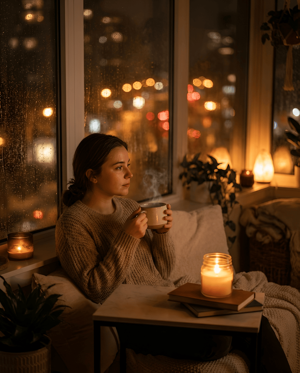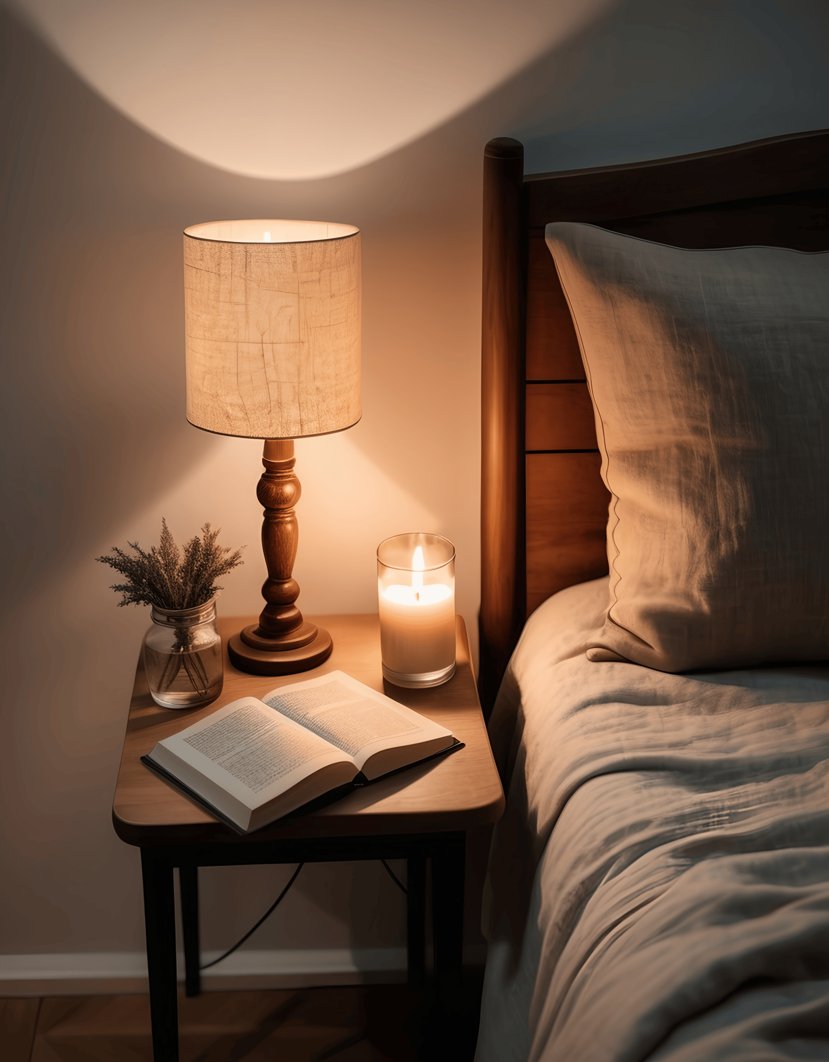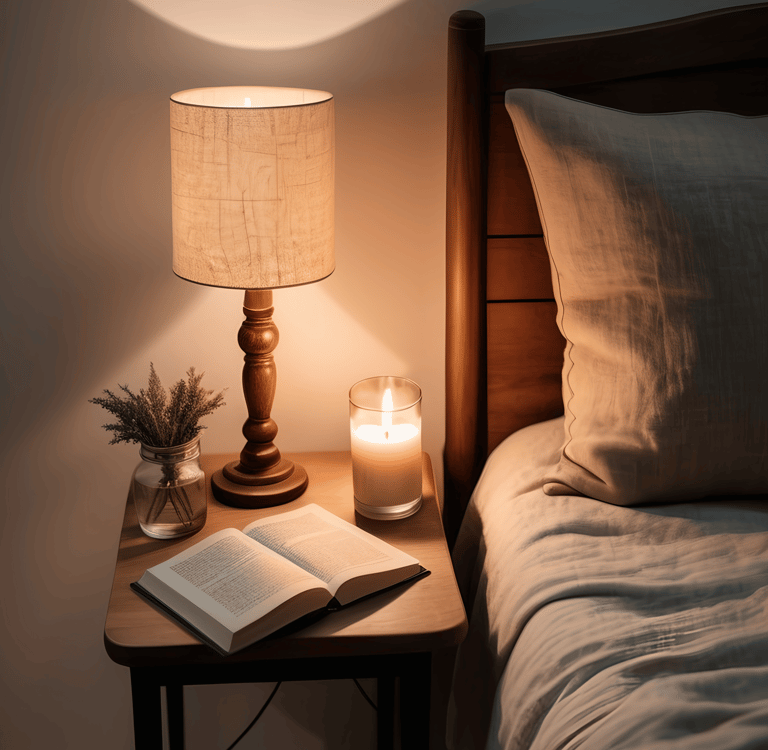 Soft blankets, warm lamplight, no blue glow.